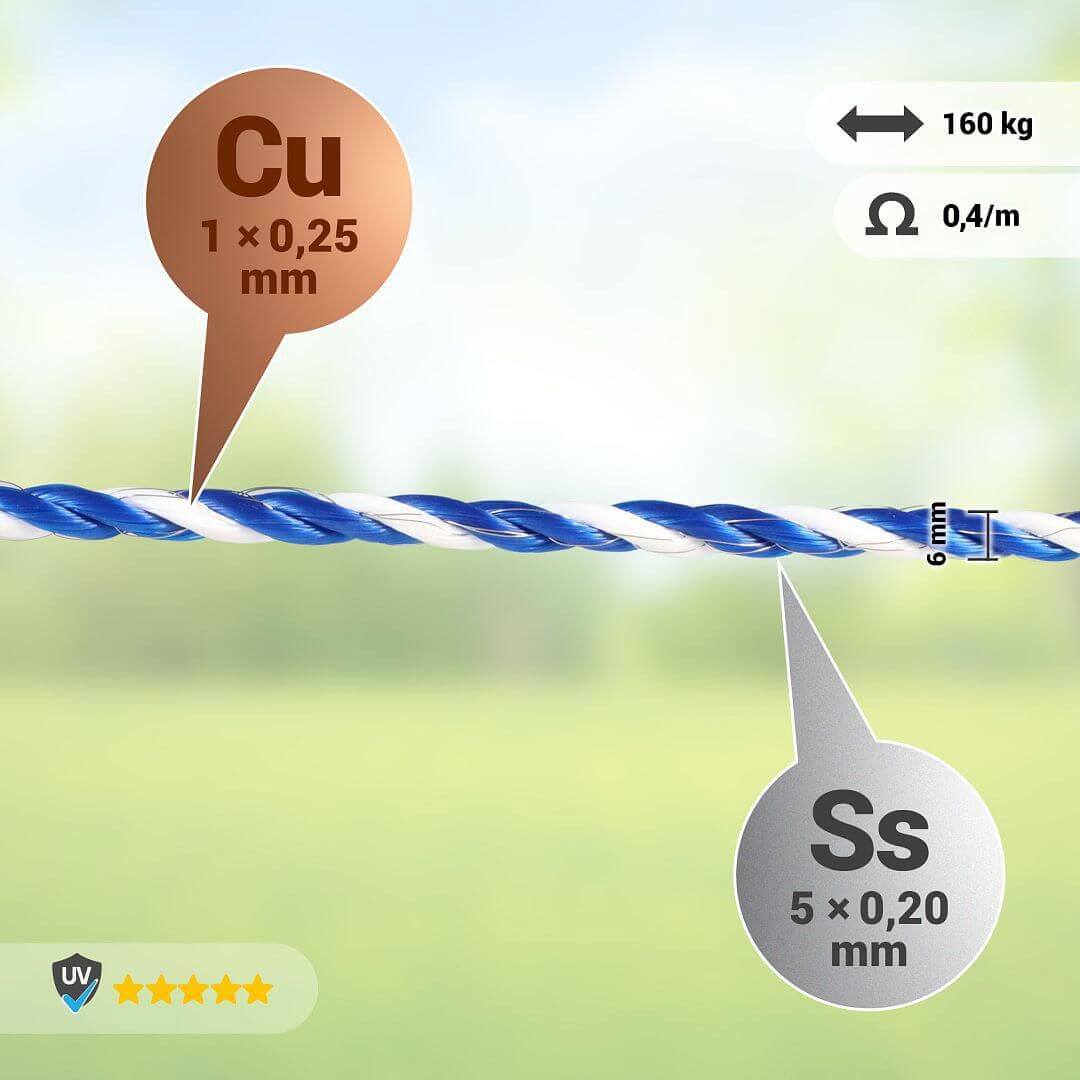 Vysokokvalitné vodivé lano na univerzálne použitie v elektrických ohradníkoch.